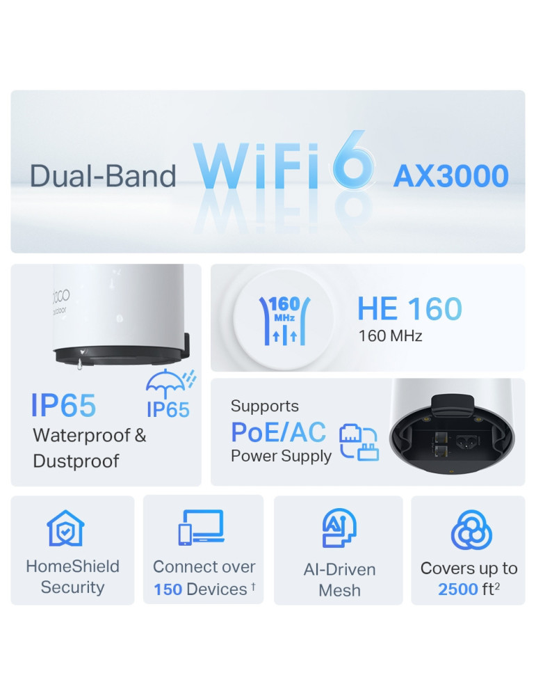 TP-Link Deco X50-Outdoor, White, Internal, Mesh system, 230 m², Dual-band (2.4 GHz / 5 GHz), Wi-Fi 6 (802.11ax)
