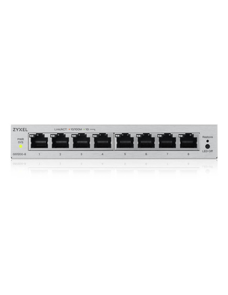 Zyxel GS1200-8V3. Switch type: Managed, Switch layer: L2. Basic switching RJ-45 Ethernet ports type: Gigabit Ethernet (10/100/1000), Basic switching RJ-45 Ethernet ports quantity: 8. Full duplex. MAC address table: 4000 entries, Switching capacity: 16 Gbit/s. Networking standards: IEEE 802.1Q, IEEE 802.1p, IEEE 802.3, IEEE 802.3ab, IEEE 802.3ad, IEEE 802.3az, IEEE 802.3u, IEEE.... Power connector: DC-in jack. Form factor: Desktop
