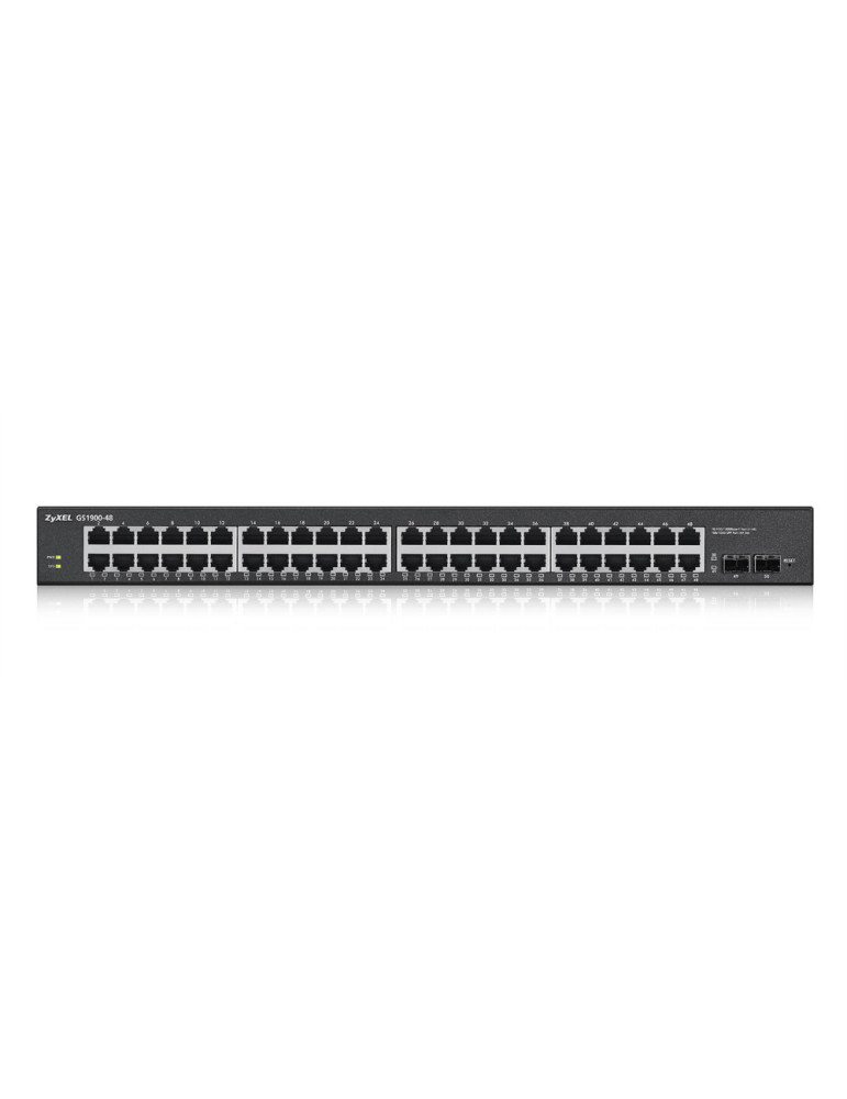 Zyxel GS1900-48-EU0102F. Switch layer: L2. Basic switching RJ-45 Ethernet ports type: Gigabit Ethernet (10/100/1000), Basic switching RJ-45 Ethernet ports quantity: 48. MAC address table: 8000 entries, Switching capacity: 100 Gbit/s. Networking standards: IEEE 802.1af, IEEE 802.1D, IEEE 802.1p, IEEE 802.3, IEEE 802.3ab, IEEE 802.3u, IEEE 802.3x. Power connector: AC-in jack. Rack mounting
