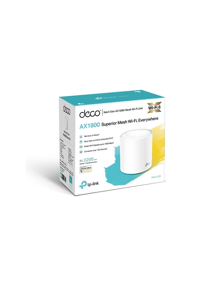 TP-Link Deco X20 (1-pack), Valkoinen, Sisäinen, Verkkoreititin, Teho, FCC: <30 dBm, CE: <20 dBm (2.4 GHz), <23 dBm (5 GHz), Kaksitaajuus (2,4 GHz/5 GHz)