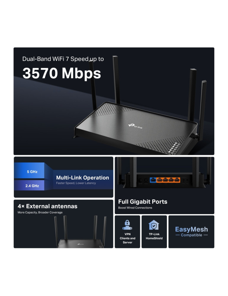 TP-Link Archer BE220, Wi-Fi 7 (802.11be), Kaksitaajuus (2,4 GHz/5 GHz), Ethernet LAN, Musta, Pöytäreititin