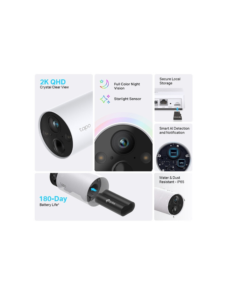 TP-Link Tapo C420S2. Modell: IP-säkerhetskamera, Placeringar som kan användas: Inomhus & utomhus, Anslutningsteknologi: Trådlös. Monteringssätt: Vägg, Produktens färg: Vit, Formfaktor: Glödlampa. Synfältsvinkel (FOV): 113°. Optisk sensorstorlek: 25,4 / 3 mm (1 / 3"). Brännviddsintervall: 3.18 mm