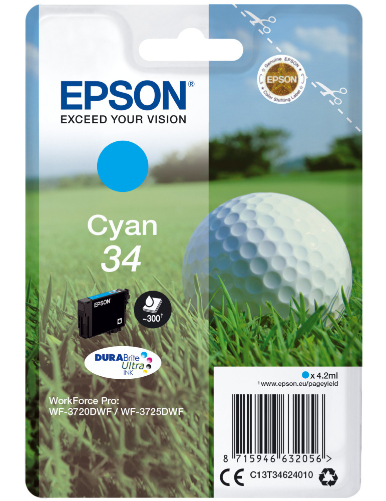 Epson Golf ball Singlepack Cyan 34 DURABrite Ultra Ink. Bläckpatron kapacitet: Standardavkastning, Antal sidor med färgpatron: 300 sidor, Volym färgpatron: 4,2 ml, Skrivarfäger: Cyan, Antal per förpackning: 1 styck