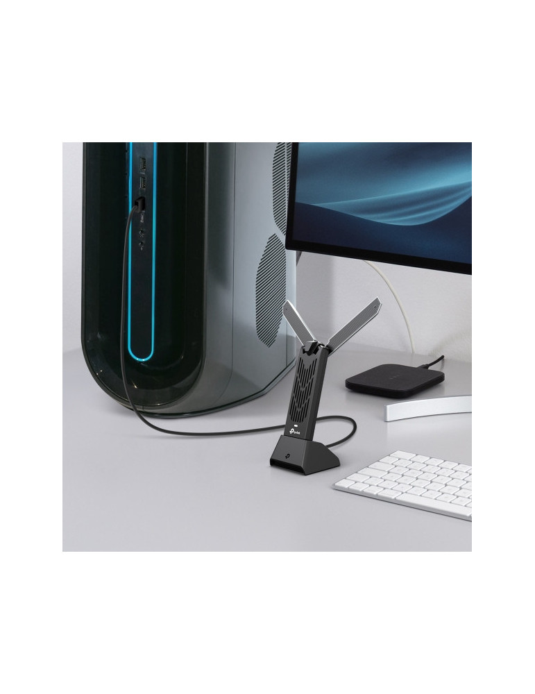 TP-Link Archer TBE400UH. Anslutningsteknologi: Kabel & Trådlös, Värdgränssnitt: USB, Gränssnitt: WLAN. Maximal dataöverföringshastighet: 2882 Mbit/s, Wi-Fi-standard: Wi-Fi 7 (802.11be), Wi-Fi-band: Triband (2,4 GHz/5 GHz/6 GHz). Produktens färg: Grå